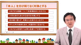 「1-2-4 「地域」におけるケア統合の推進」(4分11秒)では、地域のなかでの他職種協働、切れ目のない主治医機能連携、地域におけるケアの統合としての在宅医療と介護の水平統合、在宅医療と病院との垂直統合など、様々な連携の意義を考察します。